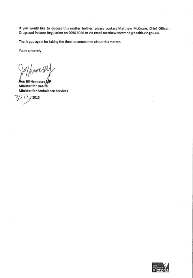 The Victorian Minister for Health and Ambulance Services the Hon Jill Hennessy MP replied to our question regarding the implementation of a real-time prescription monitoring program in Victoria. Minister Hennessy’s response and the actions taken are below. We are pleased to see the actions taken. And yes, we’ve forgiven her for referring to Mr Elia Petzierides as Ms.